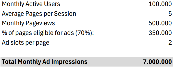 Given the niche B2B nature of the content and the targeted audience, we project an average Cost per 1,000 Impressions of €30, resulting in an estimated monthly advertising revenue of €250,000 annually. (700,000 ÷ 1,000) × €30)